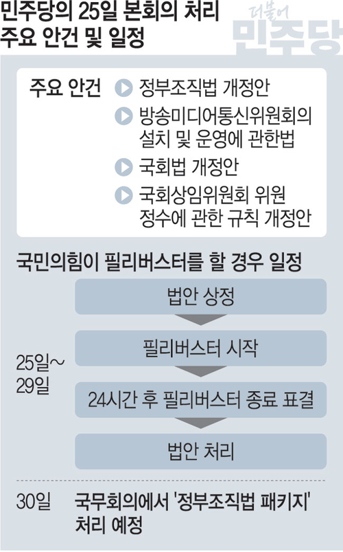 더불어민주당이 국민의힘의 무제한 토론 예고에 맞서 25일 본회의에서 정부조직법을 포함한 4개의 법안을 우선 처리하기로 했다. 이는 필리버스터로 인해 민생 법안 처리가 지연될 경우 국민의힘에 책임을 묻기 위한 전략으로 풀이된다. 민주당은 필리버스터 대결을 감안해 비쟁점 법안의 처리를 미루고, 핵심 법안에 집중하기로 했다.