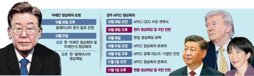 이 대통령은 APEC 정상회의를 앞두고 외교 슈퍼위크를 시작하며, 미중 정상과의 회담을 통해 무역 및 안보 문제를 논의할 예정입니다. 그는 한반도 평화와 경제 협력을 위한 방안을 모색하고 있으며, APEC 정상회의에서 글로벌 경제 질서를 재편할 기회를 잡겠다는 의지를 보였습니다.