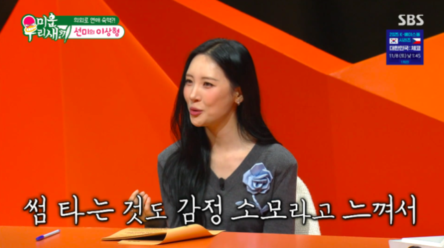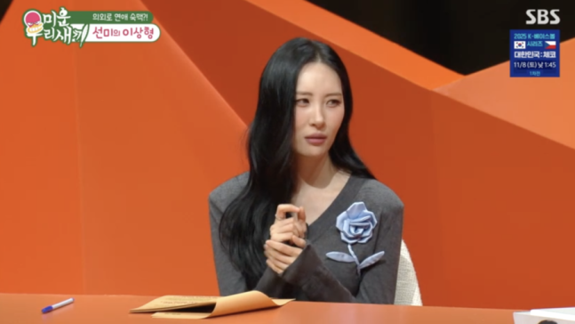 가수 선미가 자신의 연애 스타일을 공개하며, ‘썸’은 감정 소모라고 생각한다고 밝혔다. 2일 방송된 SBS ‘미운 우리 새끼’에서 선미는 연애 경험이 적다고 언급하며, 진정으로 좋아하는 사람에게는 불도저처럼 고백한다고 말했다. 그녀는 이상형으로 맷 데이먼과 각진 턱을 가진 사람을 선호한다고 덧붙였다.
