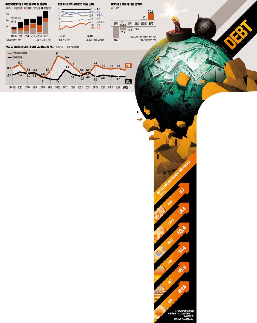 한국의 총부채가 선진국 중 가장 빠른 속도로 증가하고 있으며, 올해 1분기 기준 GDP 대비 총부채 비율이 248%에 달했다. 이는 2019년 4533조원이던 총부채가 5년 만에 6373조원으로 급증한 결과로, 부채 증가 속도가 경제 성장률을 크게 초과하고 있다. 이러한 상황은 민간 대출 부실이 국가채무 증가로 이어질 위험을 내포하고 있어, 종합적인 부채 관리가 시급하다는 지적이 나오고 있다.