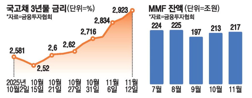 채권시장은 시중 유동성이 주식시장으로 쏠리며 자금 부족 현상이 지속되고 있다. MMF 잔액이 석 달 새 8조원 감소했으며, 5대 시중은행의 요구불예금 잔액도 33조원 이상 줄어들었다. 이러한 자금 이동은 채권시장에 부담을 주고 있으며, 경기 둔화 우려가 커지는 가운데 한은은 금리 인하 여지를 남겨두고 있다.