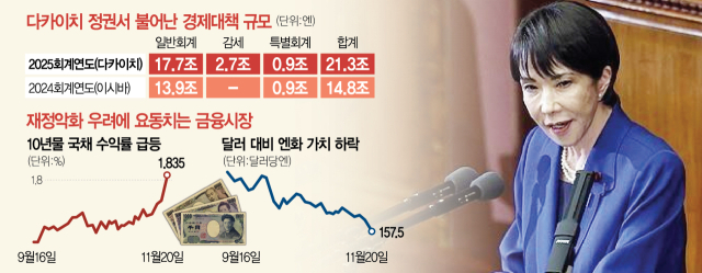 일본의 엔화 가치가 급락하며 달러당 157엔을 넘어섰고, 10년 만기 국채 금리는 17년 만에 최고치를 기록했다. 이는 다카이치 사나에 총리가 발표한 대규모 경제 대책과 관련이 깊다. 정부는 자녀 한 명당 2만엔을 지급하는 방안을 포함한 21조3000억엔 규모의 경제 종합 대책을 준비 중이다.