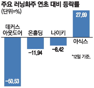 러닝화 시장에서 아식스가 유일하게 상승세를 보이고 있는 가운데, 나이키와 아디다스는 각각 8.42%와 29.47% 하락했다. 아식스는 여성 소비자층을 겨냥한 브랜드 이미지 쇄신에 성공하며 주가가 27% 상승했으며, 이는 다른 브랜드와의 대조적인 결과를 보여준다. 반면, 데커스아웃도어는 올해 주가가 반토막 나며 가장 큰 타격을 입었다.