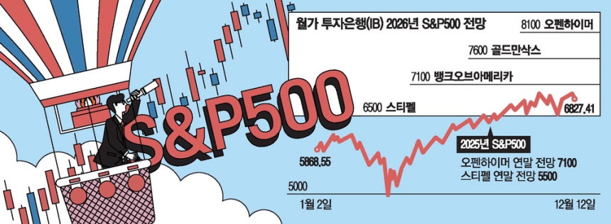 내년 미국 증시 전망이 두 개의 상반된 예측으로 나뉘어 주목받고 있다. 투자은행 오펜하이머는 S&P500 지수가 8100에 이를 것이라며 AI의 영향력을 강조한 반면, 스티펠은 개인 소비 부진으로 인해 6500까지 하락할 수 있다고 경고했다. 현재 S&P500은 6827.41로 마감하며 두 예측의 중간에 위치하고 있다.