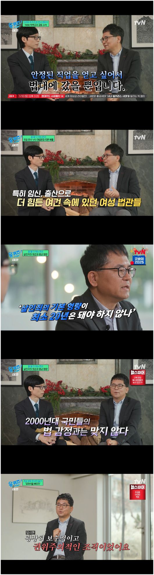문유석 작가는 ‘유퀴즈 온 더 블럭’에서 여성 법관의 어려움을 언급하며, 임신과 출산으로 인한 고충을 강조했다. 그는 ‘국민도 중요하지만 판사도 노동자’라는 점을 상기시키며, 살인죄의 형량을 20년으로 올려야 한다고 주장했다. 문 작가는 과거의 보수적인 판결 관행이 현재의 법 정서와 맞지 않다고 지적하며, 형량 상향 조정의 필요성을 역설했다.