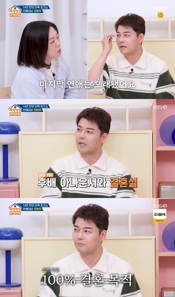 전현무가 결혼에 대한 솔직한 생각을 털어놓았다. KBS2 '옥탑방의 문제아들'에 출연한 그는 결혼에 대한 질문에 '곧 반백살'이라며 늦깎이 결혼을 한 김종국에게 조언을 구했다. 김종국은 결혼에 대한 확고한 생각이 있었다고 전하며, 전현무는 '결혼을 위해 결혼하는 것은 싫다'고 강조했다.