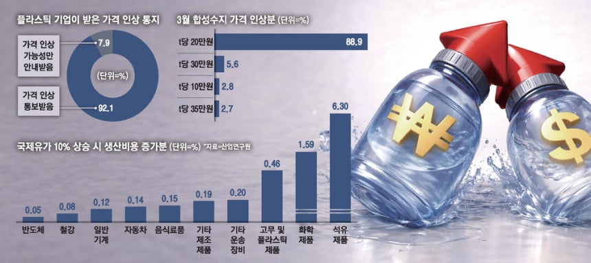 전 세계적으로 원료 공급망이 위기에 처하면서 국내 플라스틱 기업 71%가 원료 공급 축소 또는 중단 가능성을 통보받았다. 이란 전쟁의 여파로 석유제품 기업들이 직격탄을 맞고 있으며, 유가가 10% 오를 경우 제조업 전체 생산비는 0.71% 증가하는 것으로 나타났다. 특히 석유제품의 생산비용은 6.3%나 상승할 것으로 예상되며, 이는 중소기업의 수익성 악화로 이어질 수 있다.