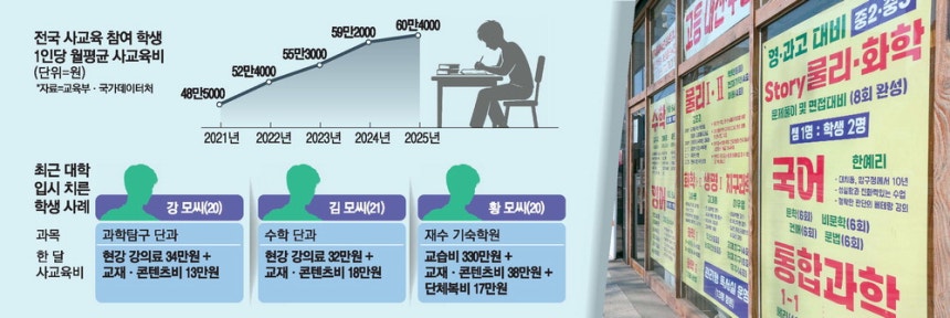 대학 입시를 위한 사교육비 중 교재비가 큰 부담으로 작용하고 있으며, 서울 강남구의 학원가에서는 필수 교재와 콘텐츠비가 추가로 발생하고 있다. 전문가들은 교재비의 투명한 산출과 가격 규정이 필요하다고 지적하고 있다.